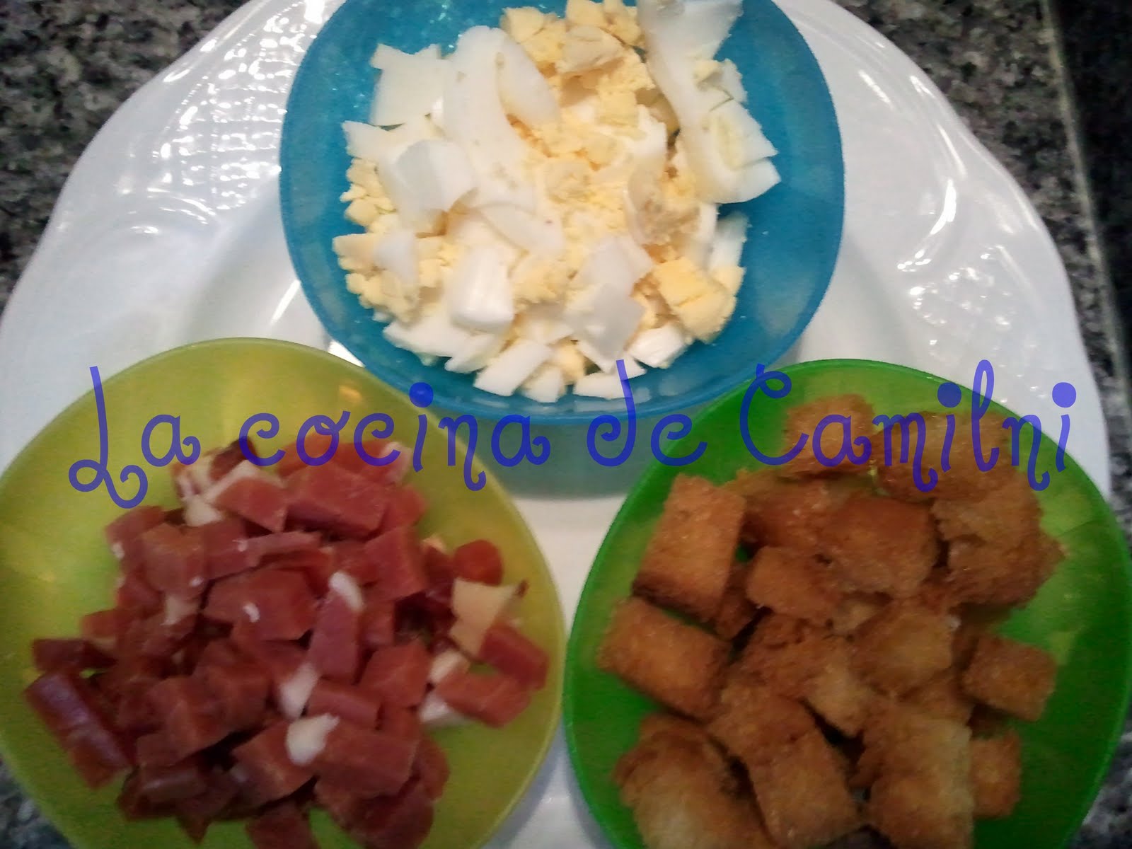 Podemos echarle al plato, huevo duro picaditos con taquitos de jamón y picatoste con sabor a ajo y perejil o sin sabor, y se le llama sopa de picadillo, cuando le echamos estos ingredientes, o sino los picatostes lo podemos hacer en casa, como yo he hecho, cogemos una telera de pan y cortamos en daditos los moldes, para 4 personas, dos moldes y luego lo echamos en el aceite que estara caliente, hasta que esten doraditos, los sacamos y les ponemos al plato un papel absorbente, para escurrir el aceite de los picatostes.