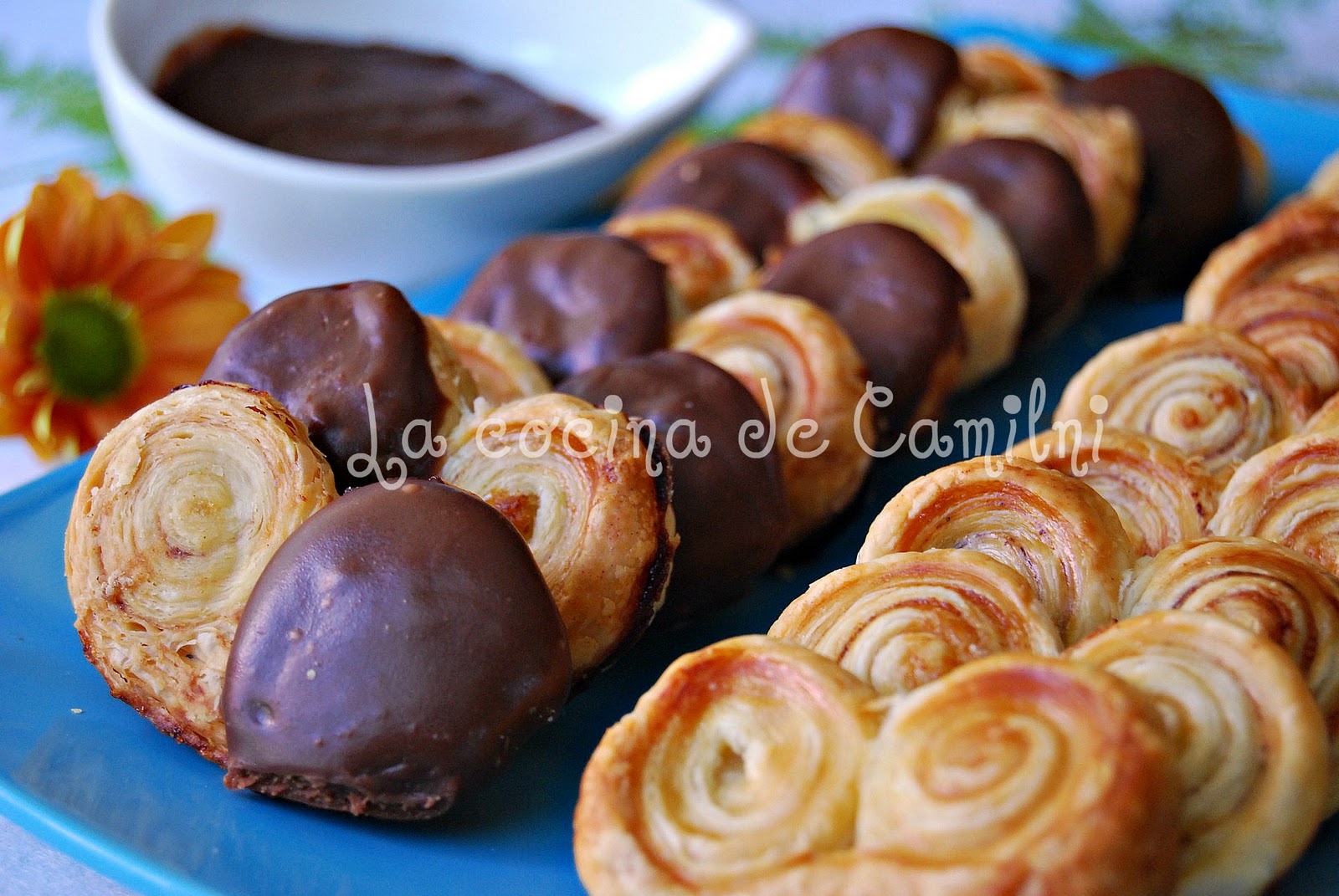 Después de que mi hermana publicara un postre de cuchara, aquí os traigo, para empezar la semana, estas palmeritas. Son muy fáciles de hacer, y quedan muy ricas con este baño de chocolate. Las he hecho minis porque quedan más monas y porque así, te comes varias sin cargo de conciencia...je..je..je. En casa a unos le gustan con chocolate, a otros sin chocolate, por este motivo he hecho mitad y mitad.