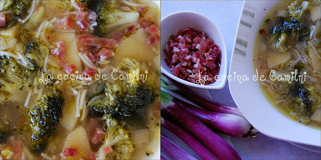Lo único que cambia de esta receta es el brócoli y el jamón. Una receta de aprovechamiento ya que guardamos el agua de cocción de la verdura utilizada, y unos ramilletes de ésta para hacer la sopa, un buen primer plato.