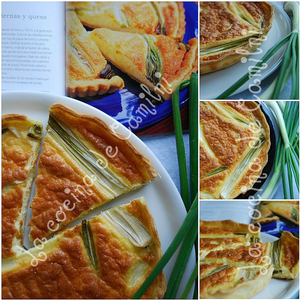 Me cuesta llegar hasta final de mes, madre mía la de "encajes de bolillos" (por así decirlo) que tengo que hacer. En casa no se tira nada de nada, es más aprovecho todo los restos que me van quedando, y voy gastando todo lo que queda en el frigorífico; el pobre mío lo tengo a dieta. Mi padre guapo (no es por decirle un piropo, es que lo es), me trajo un buen manojo de cebollas tiernas (cebolletas), tenía que hacer algo con ellas. Mirando en un libro de recetas que ganamos en un concurso, vi esta receta que me enamoró. Además que es de bajo coste, tiene unos ingredientes muy básicos y al alcance de todos; el resultado nos encantó. Os la recomiendo, por su contraste de sabor de cebolla junto con el queso de cabra y su textura suave al morder. Se puede comer tanto fría como caliente.