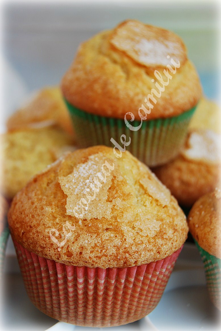 Precalentamos el horno a 250º, y cuando se metan las magdalenas bajar a 200º. Colocamos cápsulas de papel en nuestro molde para magdalenas o muffins, y llenamos hasta 3/4 de su capacidad. Espolvoreamos por encima con azúcar.