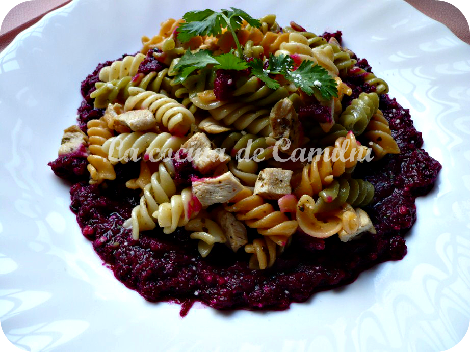 Espirales con pollo al pesto de remolacha